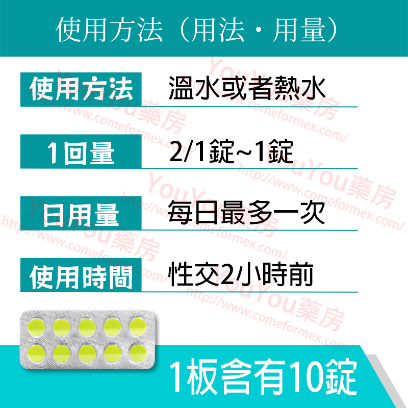 建議用量: 性行為前1-3小時服用一粒,整粒吞服,建議搭配足量開水(至少200ml)